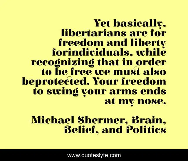 This page presents the quote "Yet basically, libertarians are for freedom and liberty forindividuals, while recognizing that in order to be free we must also beprotected. Your freedom to swing your arms ends at my nose.". Author of this quote is Michael Shermer, Brain, Belief, and Politics. This quote is about libertarian, freedom, liberty,.