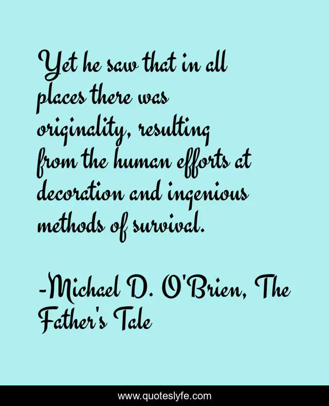 This page presents the quote "Yet he saw that in all places there was originality, resulting from the human efforts at decoration and ingenious methods of survival.". Author of this quote is Michael D. O'Brien, The Father's Tale. This quote is about places, people,.