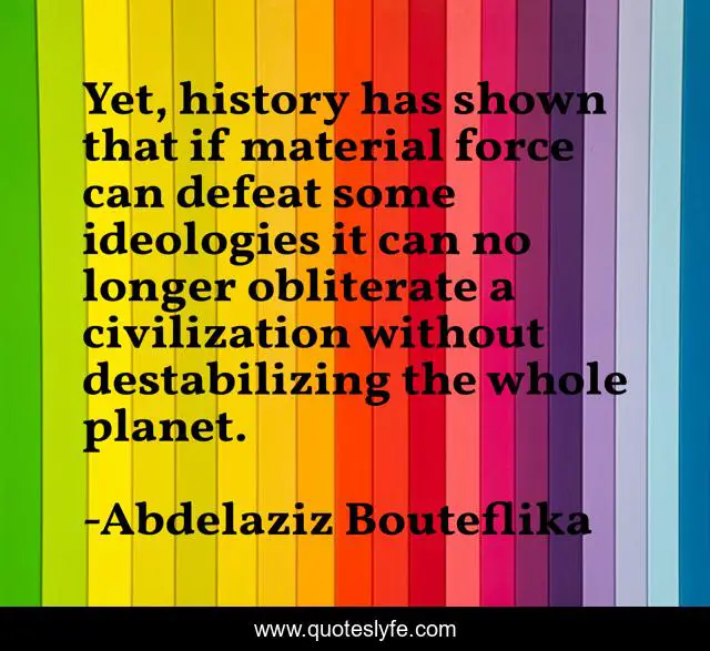 This page presents the quote "Yet, history has shown that if material force can defeat some ideologies it can no longer obliterate a civilization without destabilizing the whole planet.". Author of this quote is Abdelaziz Bouteflika. This quote is about civilization, defeat,.
