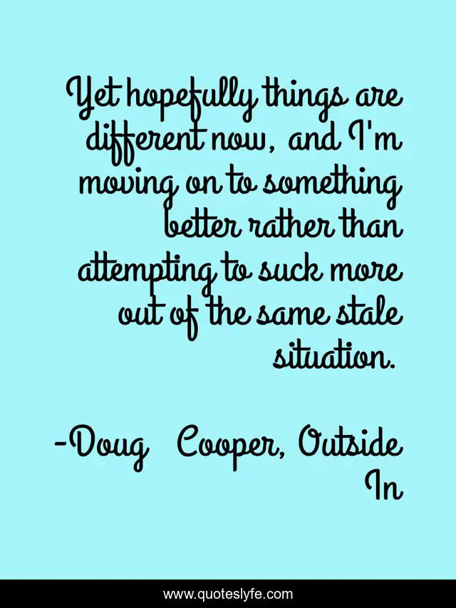 This page presents the quote "Yet hopefully things are different now, and I'm moving on to something better rather than attempting to suck more out of the same stale situation.". Author of this quote is Doug Cooper, Outside In. This quote is about stale, change-your-life, change, hope,.