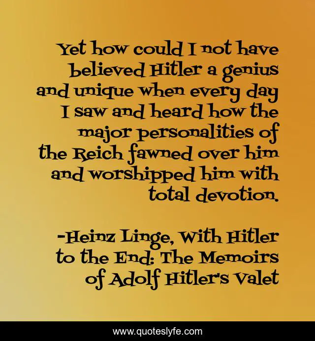 This page presents the quote "Yet how could I not have believed Hitler a genius and unique when every day I saw and heard how the major personalities of the Reich fawned over him and worshipped him with total devotion.". Author of this quote is Heinz Linge, With Hitler to the End: The Memoirs of Adolf Hitler's Valet. This quote is about enthusiasm, biography, inspirational, truth,.