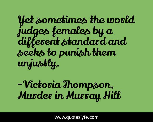 This page presents the quote "Yet sometimes the world judges females by a different standard and seeks to punish them unjustly.". Author of this quote is Victoria Thompson, Murder in Murray Hill. This quote is about gender-inequality, sarah-brandt, gaslight-mystery, feminism, women,.
