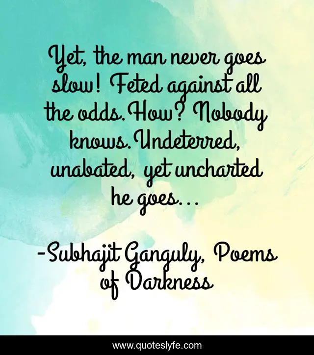 This page presents the quote "Yet, the man never goes slow! Feted against all the odds.How? Nobody knows.Undeterred, unabated, yet uncharted he goes...". Author of this quote is Subhajit Ganguly, Poems of Darkness. This quote is about slow, nobody, darkness, light, fond, literature, beloved, poems, man,.