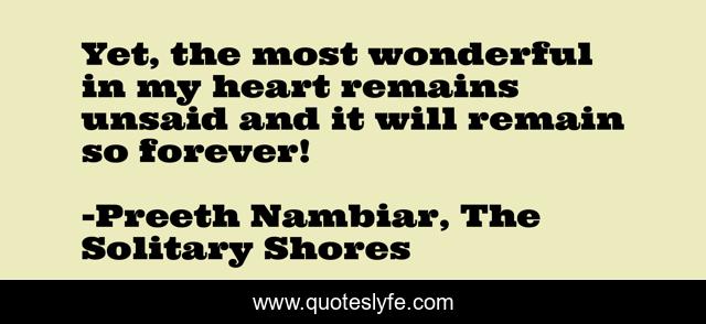 This page presents the quote "Yet, the most wonderful in my heart remains unsaid and it will remain so forever!". Author of this quote is Preeth Nambiar, The Solitary Shores. This quote is about silence-in-life, preeth-nambiar-poetry, silence, unsaid-words, preeth-nambiar,.