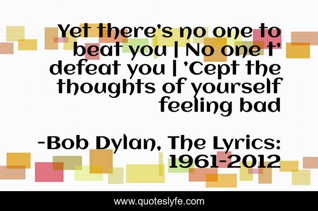 This page presents the quote "Yet there’s no one to beat you | No one t’ defeat you | ’Cept the thoughts of yourself feeling bad". Author of this quote is Bob Dylan, The Lyrics: 1961-2012. This quote is about confidence, assertiveness, self-esteem,.
