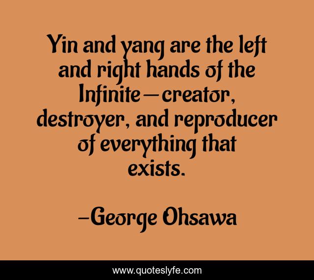 This page presents the quote "Yin and yang are the left and right hands of the Infinite — creator, destroyer, and reproducer of everything that exists.". Author of this quote is George Ohsawa. This quote is about tai-chi, macrobiotics, food, universe, yin-yang, philosophy, spirituality, health, tao,.