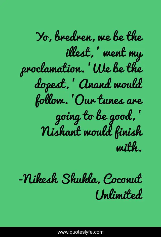 This page presents the quote "Yo, bredren, we be the illest, ' went my proclamation. 'We be the dopest, ' Anand would follow. 'Our tunes are going to be good, ' Nishant would finish with.". Author of this quote is Nikesh Shukla, Coconut Unlimited. .