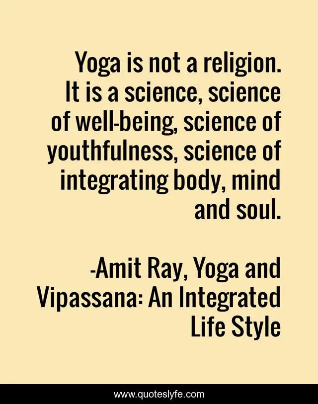 This page presents the quote "Yoga is not a religion. It is a science, science of well-being, science of youthfulness, science of integrating body, mind and soul.". Author of this quote is Amit Ray, Yoga and Vipassana: An Integrated Life Style. This quote is about living, yoga, inspirational, enthusiasm, lifestyle, meditation,.