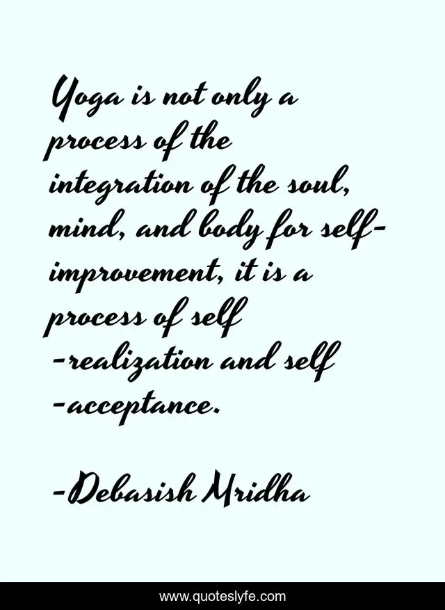 This page presents the quote "Yoga is not only a process of the integration of the soul, mind, and body for self-improvement, it is a process of self -realization and self -acceptance.". Author of this quote is Debasish Mridha. This quote is about yoga, quotes, philosophy, debasish-mridha, self-realization, self-improvement, inspirational, self-acceptance, enthusiasm,.