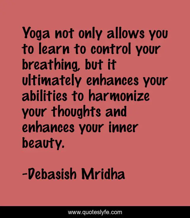 This page presents the quote "Yoga not only allows you to learn to control your breathing, but it ultimately enhances your abilities to harmonize your thoughts and enhances your inner beauty.". Author of this quote is Debasish Mridha. This quote is about yoga, harmonize-your-thoughts, philosophy, debasish-mridha, learn-to-control-your-breathing, quotes, debasish-mridha-md, inspirational, enhance-your-inner-beauty,.