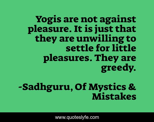 This page presents the quote "Yogis are not against pleasure. It is just that they are unwilling to settle for little pleasures. They are greedy.". Author of this quote is Sadhguru, Of Mystics & Mistakes. This quote is about pleasure, yoga, yogi,.