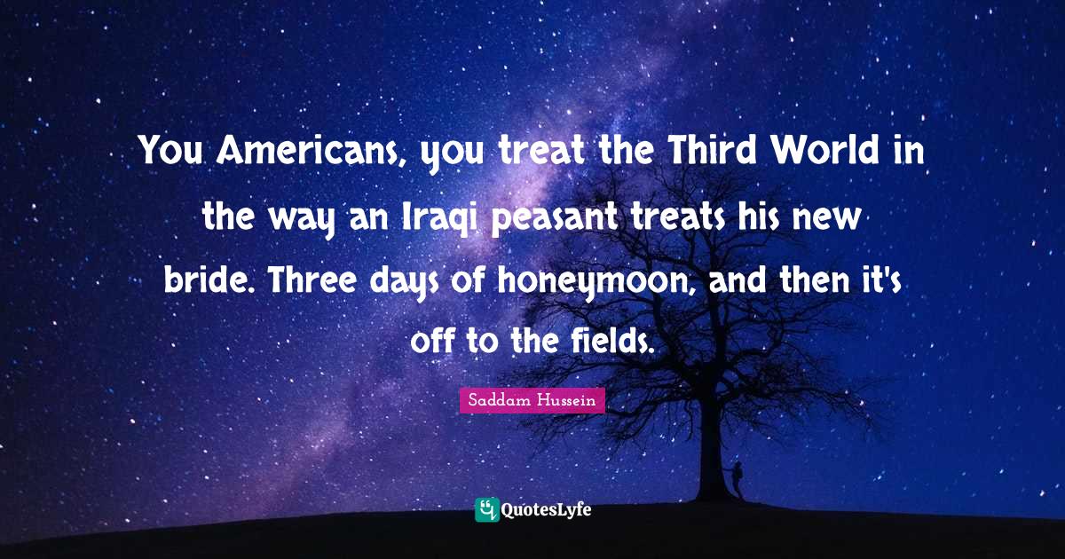This page presents the quote "You Americans, you treat the Third World in the way an Iraqi peasant treats his new bride. Three days of honeymoon, and then it's off to the fields.". Author of this quote is Saddam Hussein. This quote is about honeymoon, way, third world, three, hussein, fields, treats, world,.