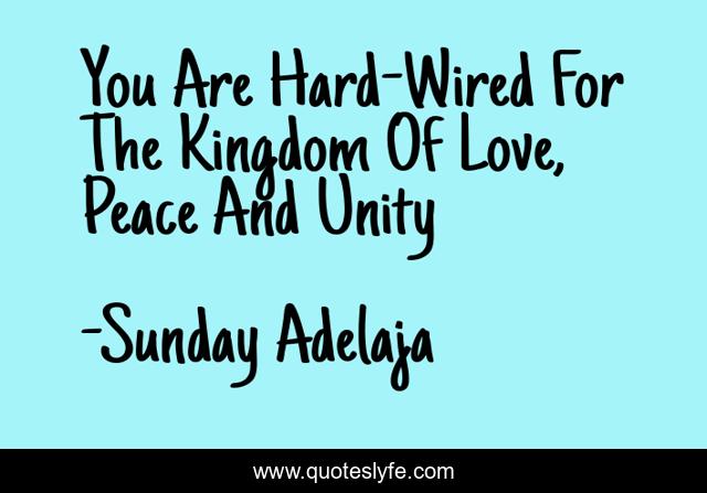 This page presents the quote "You Are Hard-Wired For The Kingdom Of Love, Peace And Unity". Author of this quote is Sunday Adelaja. This quote is about kingdom, unity, peace, love, affection,.