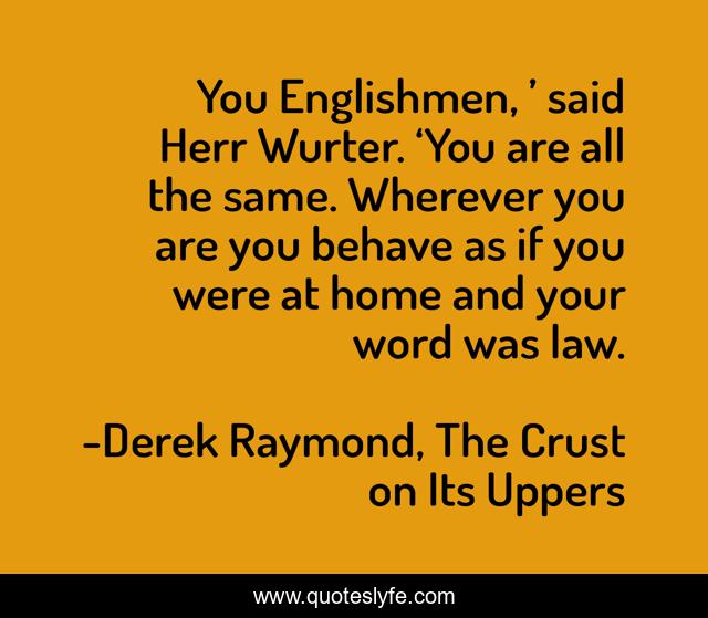 This page presents the quote "You Englishmen, ’ said Herr Wurter. ‘You are all the same. Wherever you are you behave as if you were at home and your word was law.". Author of this quote is Derek Raymond, The Crust on Its Uppers. This quote is about crime-ficiton, humour, crime, englishmen, english, crime-thriller,.