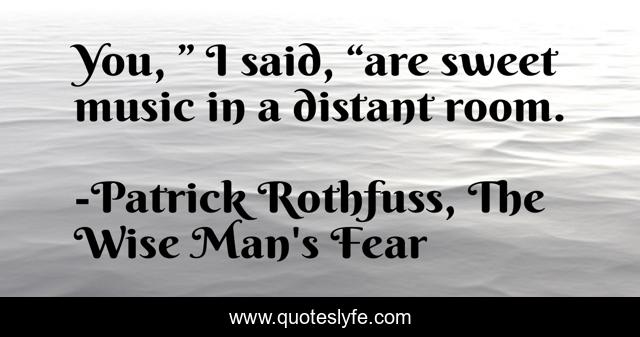 This page presents the quote "You, ” I said, “are sweet music in a distant room.". Author of this quote is Patrick Rothfuss, The Wise Man's Fear. This quote is about distant-room, denna, music, kvothe,.
