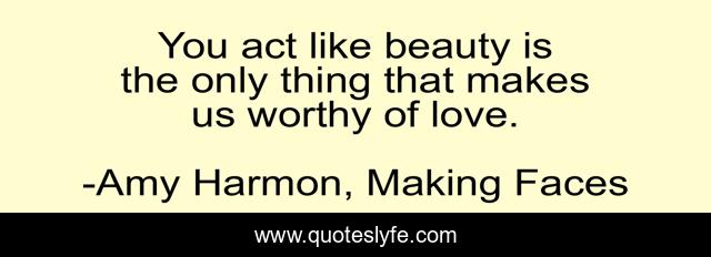 This page presents the quote "You act like beauty is the only thing that makes us worthy of love.". Author of this quote is Amy Harmon, Making Faces. This quote is about beauty, making-faces, amy-harmon,.