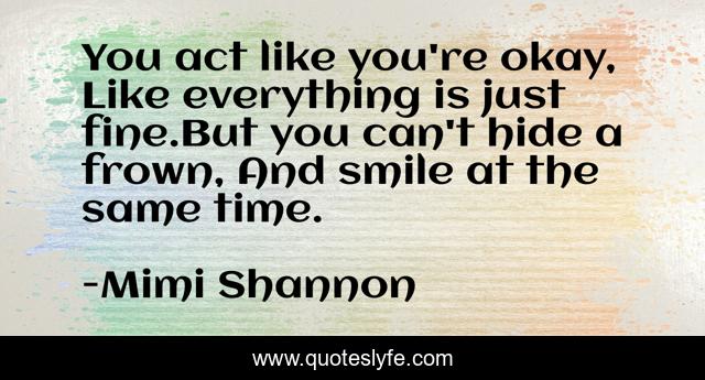 This page presents the quote "You act like you're okay, Like everything is just fine.But you can't hide a frown, And smile at the same time.". Author of this quote is Mimi Shannon. This quote is about smile, life, happiness,.