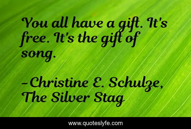 This page presents the quote "You all have a gift. It's free. It's the gift of song.". Author of this quote is Christine E. Schulze, The Silver Stag. This quote is about magic, gift, song, free, stag, music, inspirational-life, last, silver,.