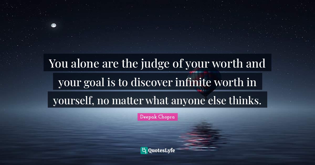 This page presents the quote "You alone are the judge of your worth and your goal is to discover infinite worth in yourself, no matter what anyone else thinks.". Author of this quote is Deepak Chopra. This quote is about gratitude, spiritual, no matter what, inspirational, infinite, goal,.