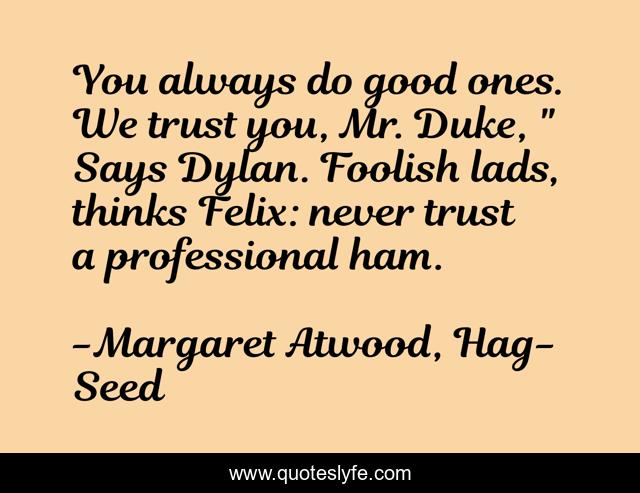 This page presents the quote "You always do good ones. We trust you, Mr. Duke, " Says Dylan. Foolish lads, thinks Felix: never trust a professional ham.". Author of this quote is Margaret Atwood, Hag-Seed. This quote is about humorous, actors,.
