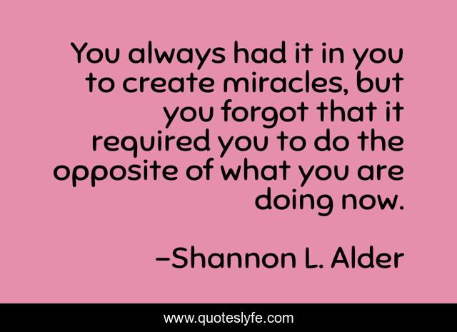 This page presents the quote "You always had it in you to create miracles, but you forgot that it required you to do the opposite of what you are doing now.". Author of this quote is Shannon L. Alder. This quote is about miracles, pay-attention, ruby-slippers, opposite, kansas, balloons, change,.
