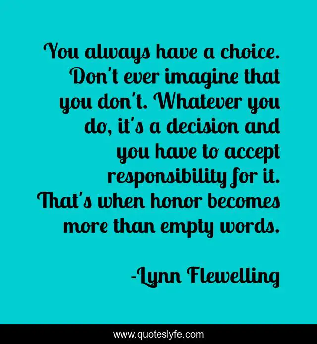 This page presents the quote "You always have a choice. Don't ever imagine that you don't. Whatever you do, it's a decision and you have to accept responsibility for it. That's when honor becomes more than empty words.". Author of this quote is Lynn Flewelling. This quote is about lynn-flewelling, stalking-darkness, honor, choice,.