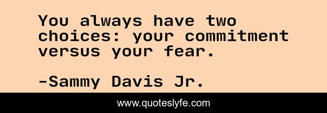 This page presents the quote "You always have two choices: your commitment versus your fear.". Author of this quote is Sammy Davis Jr.. This quote is about fear, choices, life, commitment,.