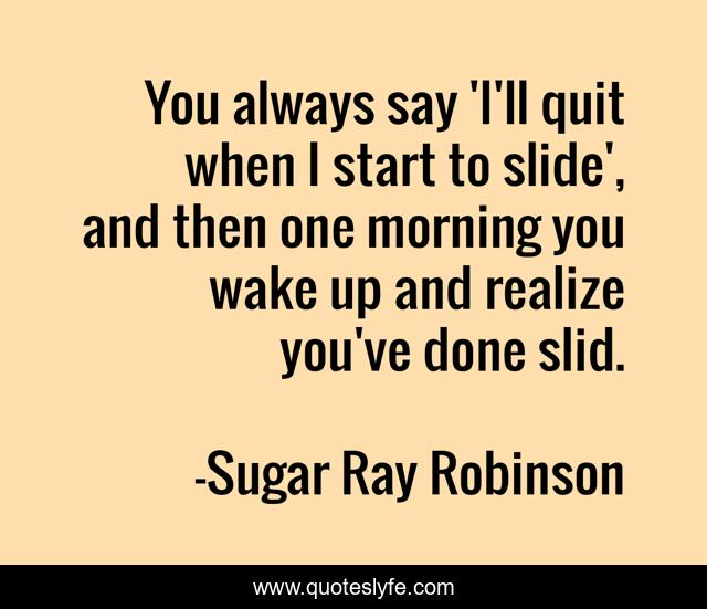 This page presents the quote "You always say 'I'll quit when I start to slide', and then one morning you wake up and realize you've done slid.". Author of this quote is Sugar Ray Robinson. This quote is about wake up, start,.