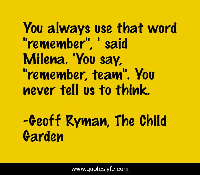 This page presents the quote "You always use that word "remember", ' said Milena. 'You say, "remember, team". You never tell us to think.". Author of this quote is Geoff Ryman, The Child Garden. This quote is about control, remember, think,.