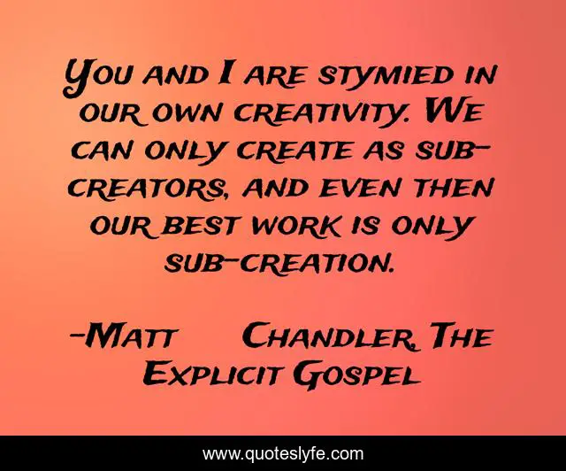 This page presents the quote "You and I are stymied in our own creativity. We can only create as sub-creators, and even then our best work is only sub-creation.". Author of this quote is Matt Chandler, The Explicit Gospel. .