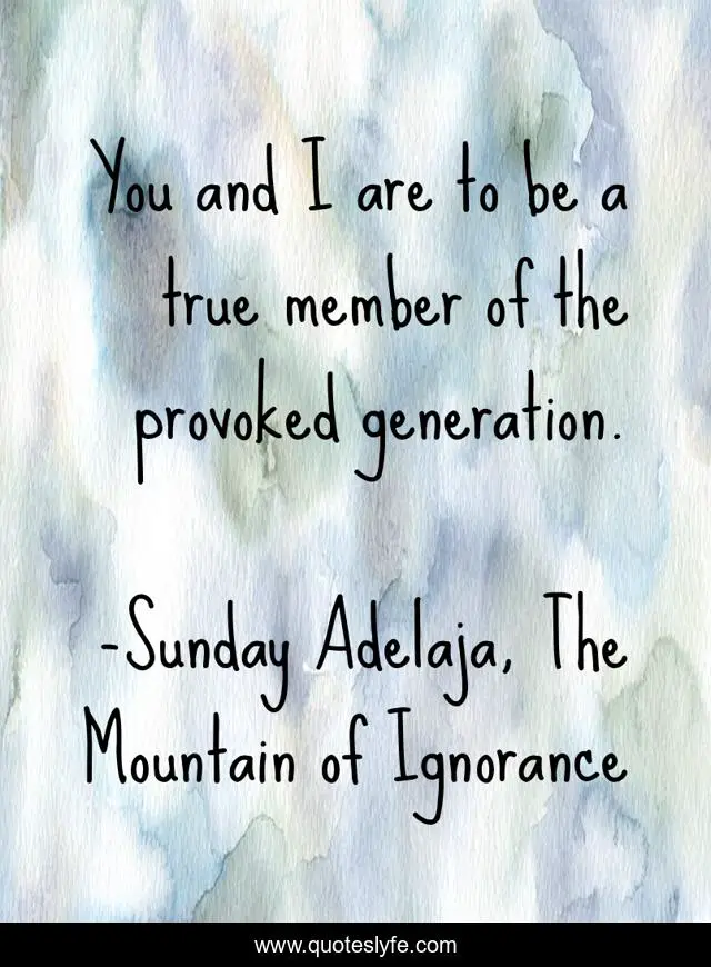 This page presents the quote "You and I are to be a true member of the provoked generation.". Author of this quote is Sunday Adelaja, The Mountain of Ignorance. This quote is about mountain, life, darkness, power, danger, generation, god, people, provoked-generation,.