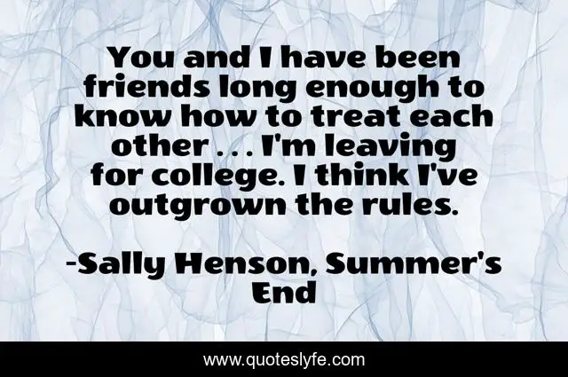 This page presents the quote "You and I have been friends long enough to know how to treat each other . . . I'm leaving for college. I think I've outgrown the rules.". Author of this quote is Sally Henson, Summer's End. This quote is about teenage-love, small-town-romance, lane, teen-series, contemporary-romance, high-school, young-adult-romance, teen-romance, coming-of-age-love-story,.