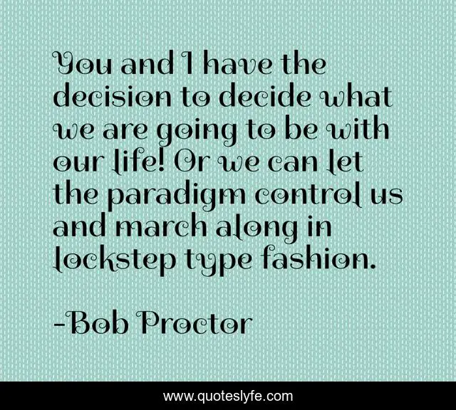This page presents the quote "You and I have the decision to decide what we are going to be with our life! Or we can let the paradigm control us and march along in lockstep type fashion.". Author of this quote is Bob Proctor. This quote is about habits, paradigm, paradigm-shift, personal-growth,.