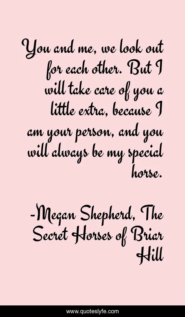 This page presents the quote "You and me, we look out for each other. But I will take care of you a little extra, because I am your person, and you will always be my special horse.". Author of this quote is Megan Shepherd, The Secret Horses of Briar Hill. This quote is about friendship, love, affection,.