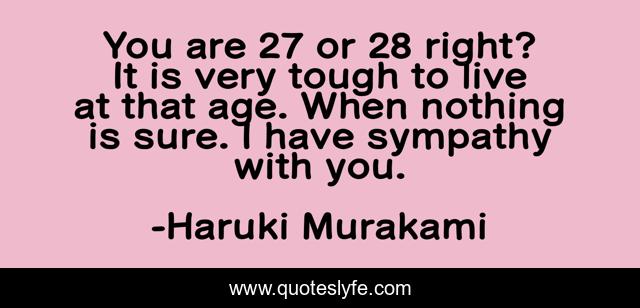 This page presents the quote "You are 27 or 28 right? It is very tough to live at that age. When nothing is sure. I have sympathy with you.". Author of this quote is Haruki Murakami. This quote is about sympathy, live,.
