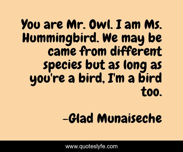 This page presents the quote "You are Mr. Owl. I am Ms. Hummingbird. We may be came from different species but as long as you're a bird, I'm a bird too.". Author of this quote is Glad Munaiseche. This quote is about true-love, owl, colibri, bird, hummingbird,.
