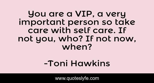 This page presents the quote "You are a VIP, a very important person so take care with self care. If not you, who? If not now, when?". Author of this quote is Toni Hawkins. This quote is about confidence, positive, support, motivational, caregivers, optimistic, inspirational, self-help, enthusiasm,.