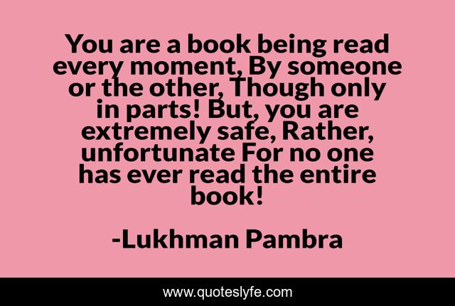 This page presents the quote "You are a book being read every moment, By someone or the other, Though only in parts! But, you are extremely safe, Rather, unfortunate For no one has ever read the entire book!". Author of this quote is Lukhman Pambra. This quote is about unfortunate-facts, lifequotes, irony, observation-on-life, psychology-of-self, book, hypocricy, reading, personality,.