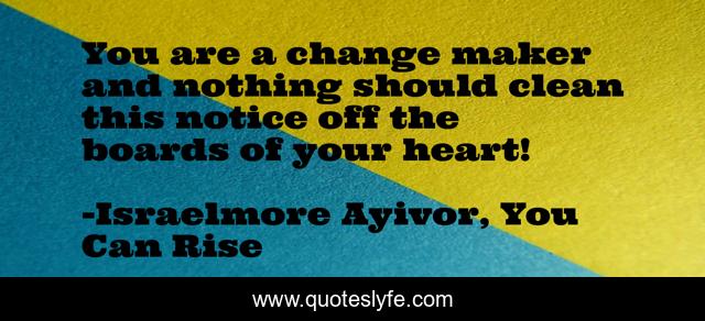 This page presents the quote "You are a change maker and nothing should clean this notice off the boards of your heart!". Author of this quote is Israelmore Ayivor, You Can Rise. This quote is about heart, notice, change-maker, boards, food-for-thought, change-the-world, you-can-rise, change-makers, make-a-difference,.