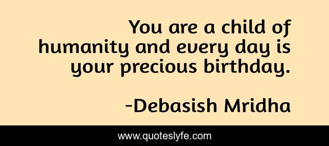 This page presents the quote "You are a child of humanity and every day is your precious birthday.". Author of this quote is Debasish Mridha. This quote is about debasish, mridha, philosophy, debasish-mridha, birthday, child-of-humanity, inspirational, enthusiasm,.
