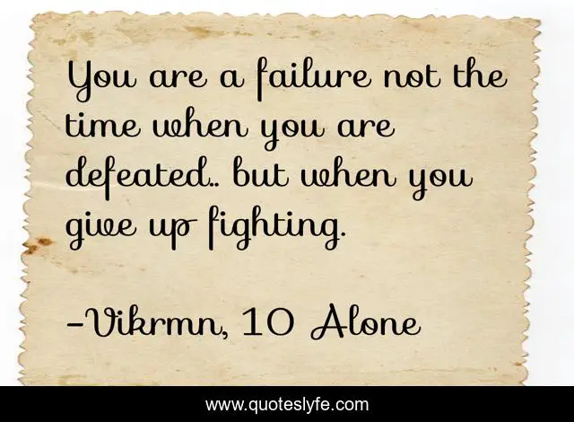 This page presents the quote "You are a failure not the time when you are defeated.. but when you give up fighting.". Author of this quote is Vikrmn, 10 Alone. This quote is about 10-alone, quoterian, give-up, ten-alone, fighting, failure, vikrmn, ca-vikram-verma, words,.