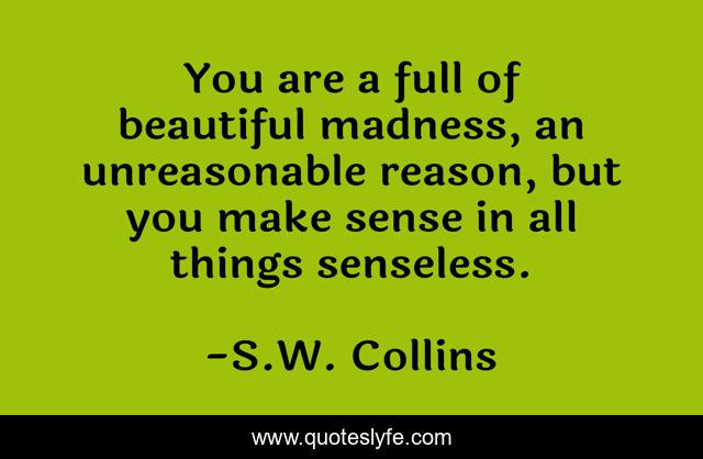 This page presents the quote "You are a full of beautiful madness, an unreasonable reason, but you make sense in all things senseless.". Author of this quote is S.W. Collins. This quote is about love, poetry, romance, inspirational, enthusiasm, affection,.