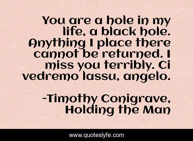 This page presents the quote "You are a hole in my life, a black hole. Anything I place there cannot be returned. I miss you terribly. Ci vedremo lassu, angelo.". Author of this quote is Timothy Conigrave, Holding the Man. This quote is about true-love, death, loss-of-love, hopeless, aids, tragedy,.