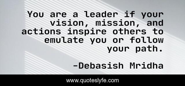 This page presents the quote "You are a leader if your vision, mission, and actions inspire others to emulate you or follow your path.". Author of this quote is Debasish Mridha. This quote is about having-vision, follow-your-path, being-a-leader, oscar-wilde, philosophy, debasish-mridha, mission, actions, quotes,.
