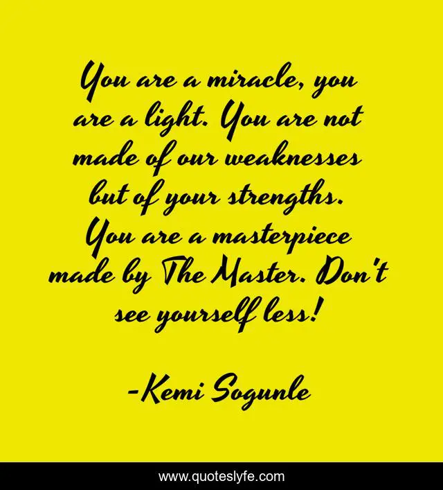 This page presents the quote "You are a miracle, you are a light. You are not made of our weaknesses but of your strengths. You are a masterpiece made by The Master. Don't see yourself less!". Author of this quote is Kemi Sogunle. This quote is about empowerment, inspirational, life, miracle, miracle-of-life, encouragement, truth, enthusiasm, truth-for-life,.