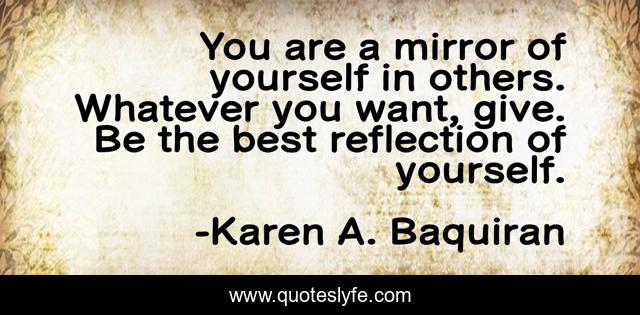 This page presents the quote "You are a mirror of yourself in others. Whatever you want, give. Be the best reflection of yourself.". Author of this quote is Karen A. Baquiran. This quote is about giving-your-best, mirror, reflection, best, mirrors,.
