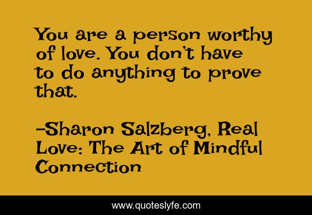 This page presents the quote "You are a person worthy of love. You don’t have to do anything to prove that.". Author of this quote is Sharon Salzberg, Real Love: The Art of Mindful Connection. This quote is about positive, meditation, motivational, optimistic, confidence,.