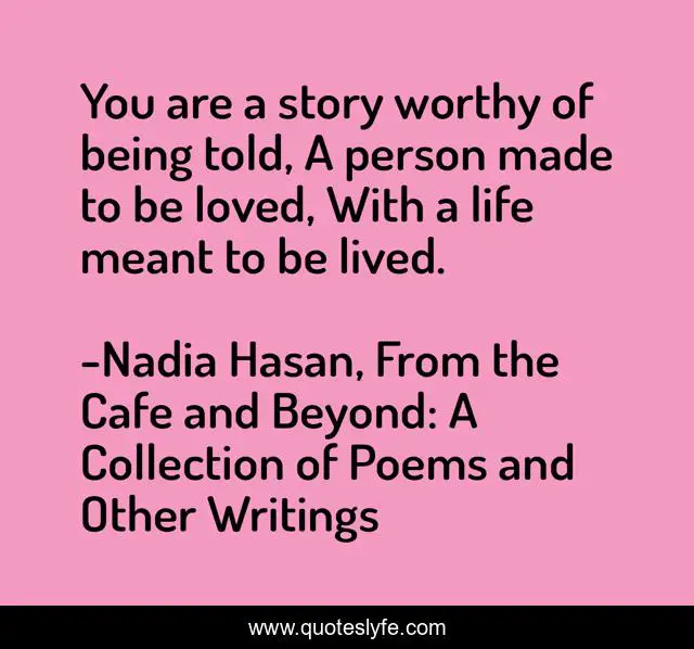This page presents the quote "You are a story worthy of being told, A person made to be loved, With a life meant to be lived.". Author of this quote is Nadia Hasan, From the Cafe and Beyond: A Collection of Poems and Other Writings. This quote is about why-a-writer, purpose-of-life, purpose, hope,.