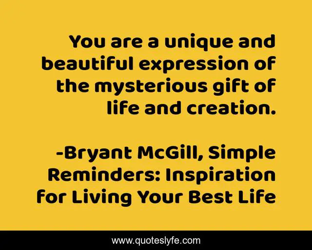 This page presents the quote "You are a unique and beautiful expression of the mysterious gift of life and creation.". Author of this quote is Bryant McGill, Simple Reminders: Inspiration for Living Your Best Life. This quote is about mystery, life, uniqueness, beauty,.