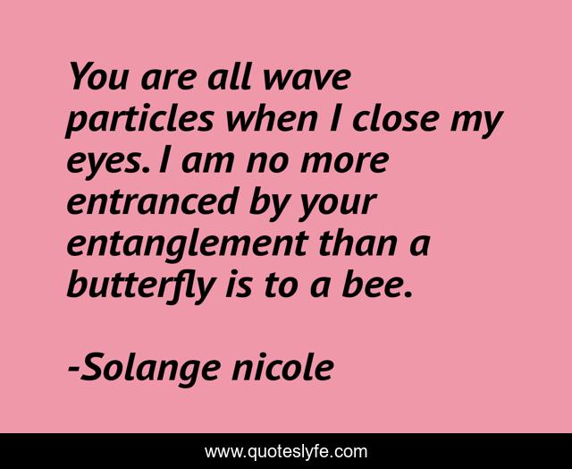 This page presents the quote "You are all wave particles when I close my eyes. I am no more entranced by your entanglement than a butterfly is to a bee.". Author of this quote is Solange nicole. This quote is about quantum-enchantment, wave-particle-theory, humorous, quantum-entanglement, smartass, smart,.
